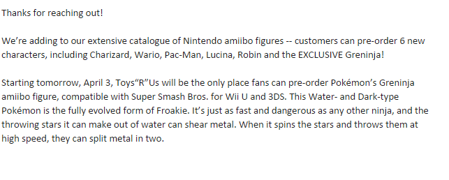 It’s official: the Greninja amiibo will be a Toys “R” Us exclusive in North America. This has been confirmed via an official statement from the retailer (see above). Pre-orders for Greninja will open tomorrow.