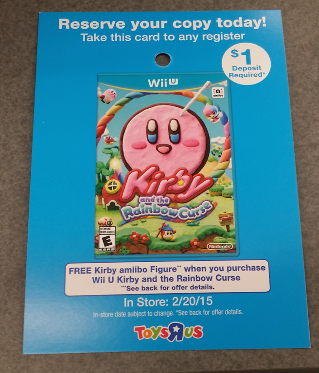 Toys “R” Us has a small offer available for Kirby and the Rainbow Curse. By pre-ordering the game, you’ll receive a Kirby amiibo.