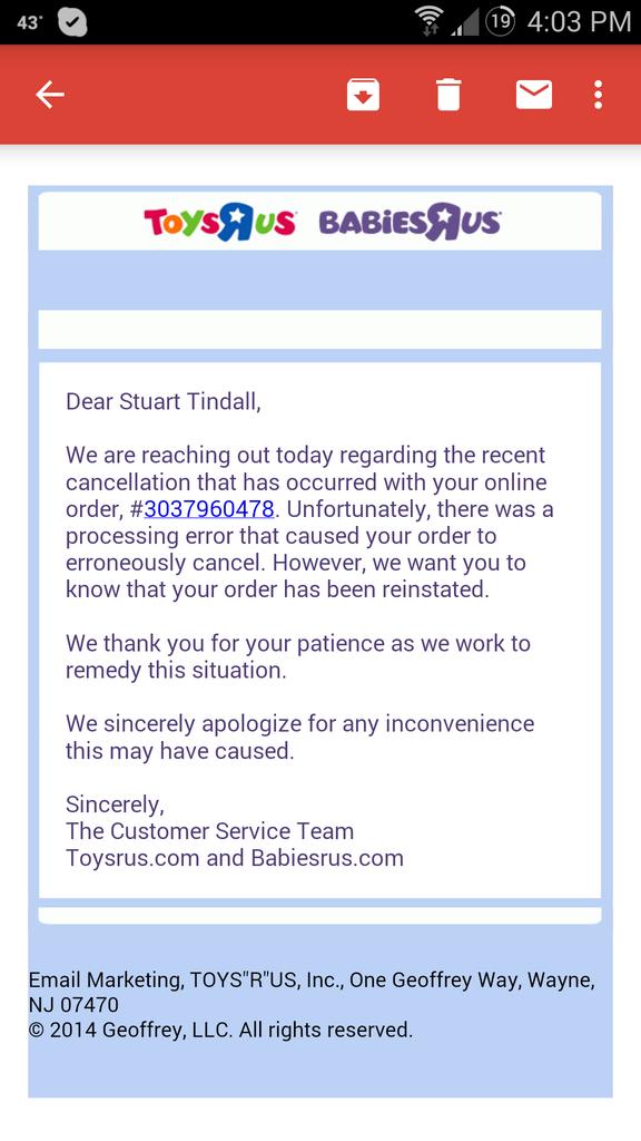 So what’s the difference? Toys “R” Us has explained that those who paid with PayPal or gift cards couldn’t have their orders return automatically. Still, the retailer will soon send out instructions about how they can reorder their item.