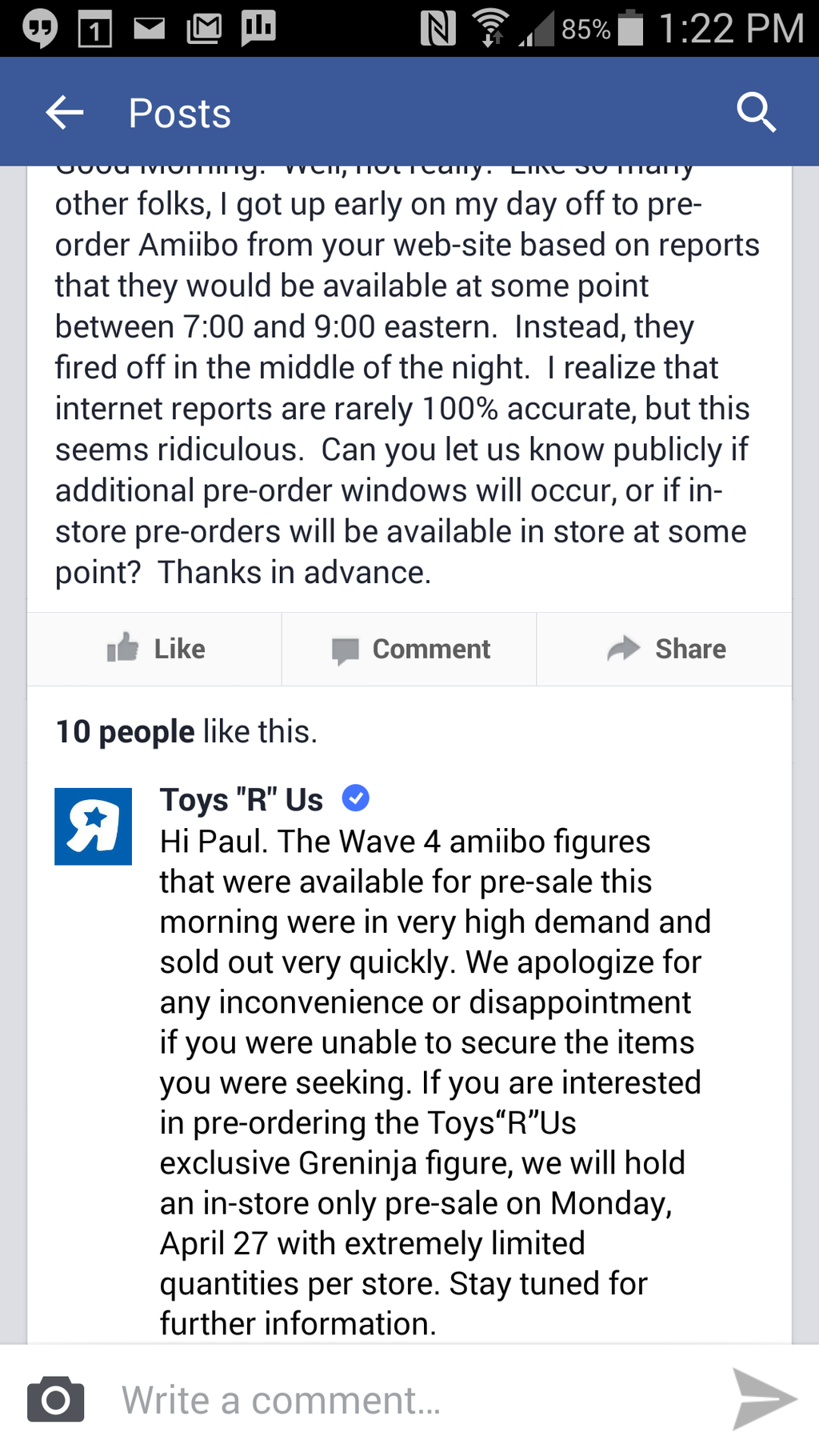 An official Facebook comment published by Toys “R” Us suggests that in-store pre-orders for the Greninja amiibo will be held on April 27. Quantities are expected to be limited.