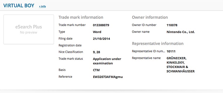 Over in Europe, Nintendo registered a new trademark for Virtual Boy. It just entered the database today.