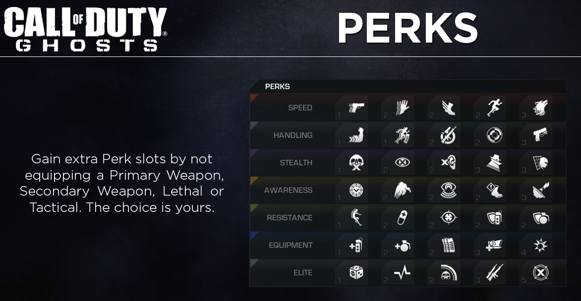Activision has shared a variety of details about Call of Duty: Ghosts’ perk system. Read on below for a roundup of information.