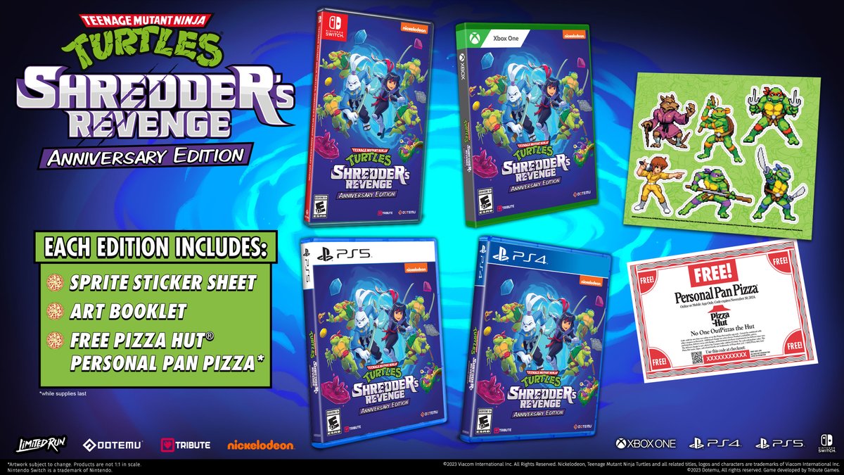 The TMNT: Shredder’s Revenge Anniversary Edition includes the main game and the Dimension Shellshock DLC. This includes Survival Mode, two brand new playable characters, Usagi and Karai, exclusive color palettes, and more. Limited Run Games is also putting in a sprite sticker sheet, art booklet, and Pizza Hut personal pan pizza coupon. Additionally, a Classic Edition of the Anniversary Edition is up for grabs that packs in a retro styled slipcover, VHS style box, and strategy guide.