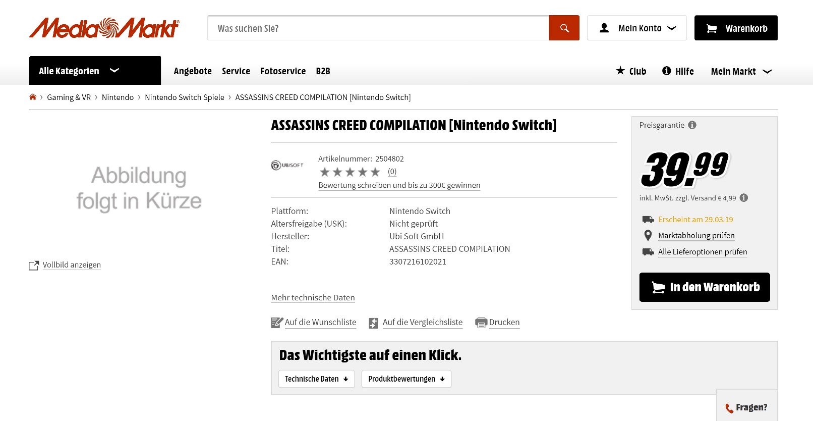 German retailer MediaMarkt has listed Assassin’s Creed Compilation for Switch as well as other platforms. The page includes a tentative March 29 release date. No further information is provided, including which titles would potentially be included.