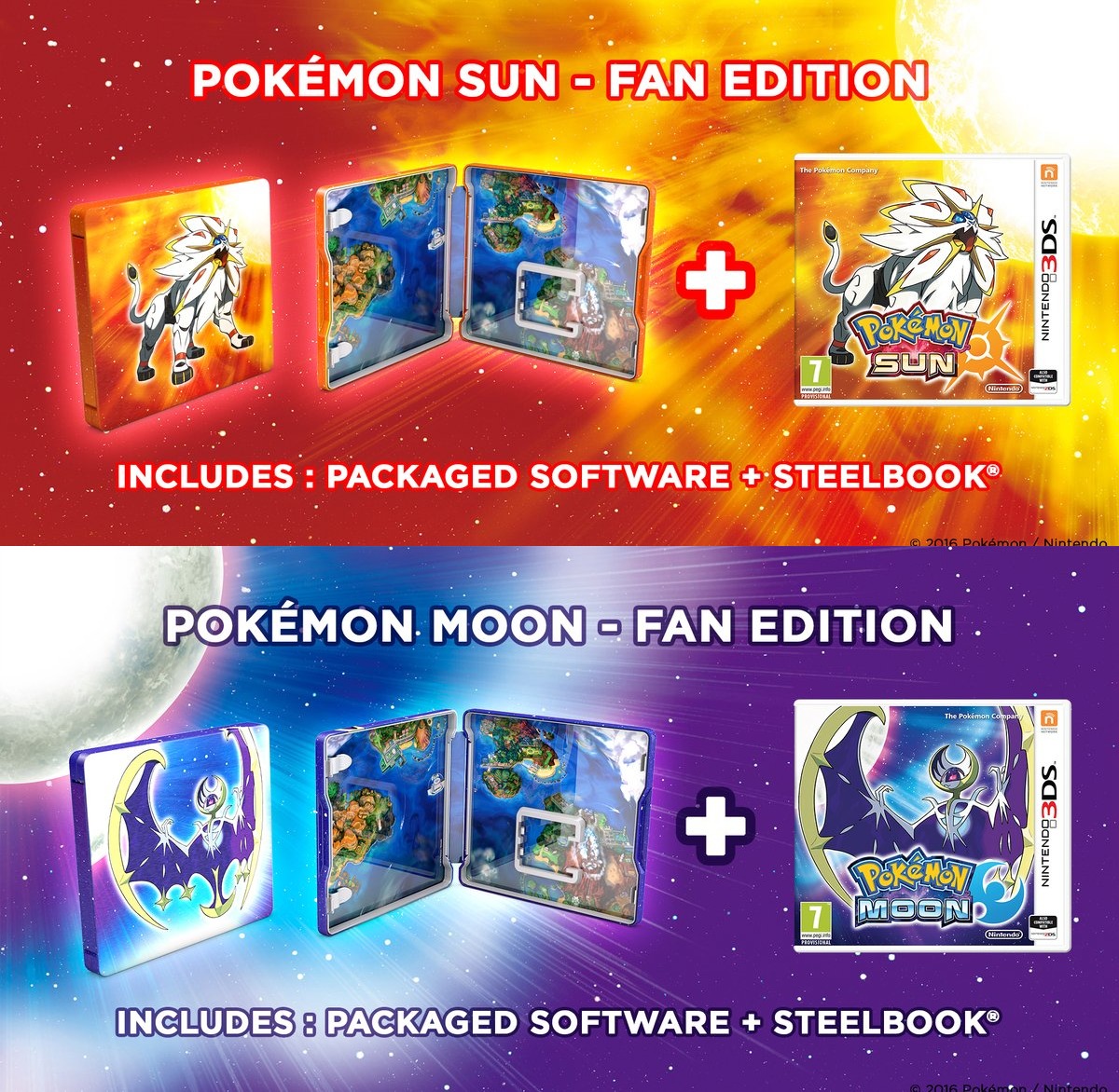 For those in Europe, you can now pre-order the Pokemon Sun/Moon Fan Editions from Amazon. In the UK, reserve the Sun version here and Moon version here. Amazon Germany has the Sun version here and Moon version here.