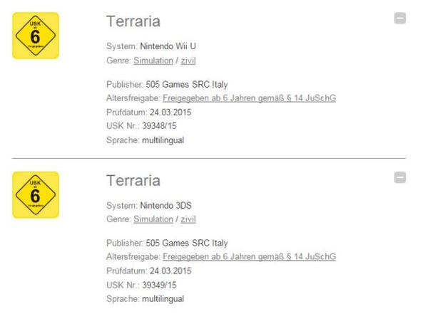 The USK – a ratings board in Germany – rated Terraria for both Wii U and 3DS. As expected, 505 Games is listed as the publisher.