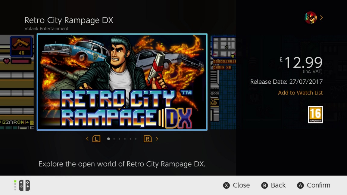 A listing on the European eShop lists Retro City Rampage DX for Switch. Although a release date is not officially set, the store lists the title for July 27.
