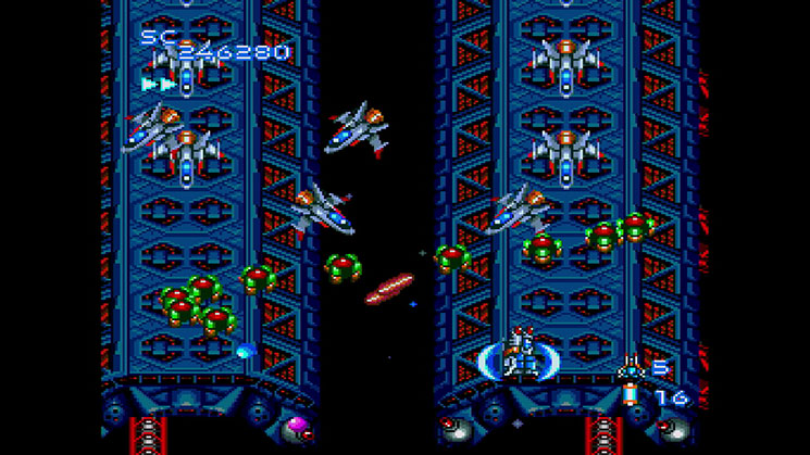 The special attack squad, led by the Mother Brain, has launched an all-out invasion on Earth. Take your small-scale fighter, the Neo Caesar, with its arsenal of four regular weapons and two special weapons, and send them back where they belong!”