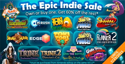 – The Epic Indie Sale – Own or buy one of the participating Nindie games and take 60 percent off ALL other participating games. The offer lasts until 8:59 a.m. PT on July 23. Visit http://www.nintendo.com/eshop/offers for more details.