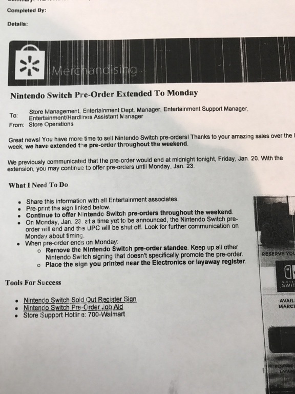 Walmart has been taking in-store pre-orders for Switch following the console’s unveiling last week, but that’s about to change. An internal notice from the retailer indicates that reservations will close on Monday.