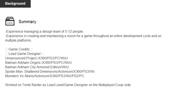 Lead game designer Pierre-Luc Foisy lists an “Unannounced Project” on his LinkedIn profile. Along with Wii U, the title is slated for the PlayStation 3, Xbox 360, and PC.