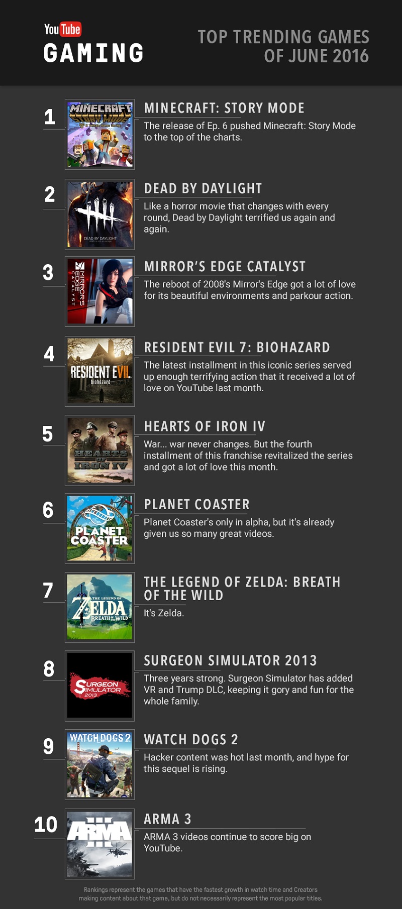 The Legend of Zelda: Breath of the Wild made YouTube’s chart as one of the top trending games of June. Stemming from its big appearance at E3, Breath of the Wild ended up at the seventh spot. Minecraft: Story Mode – a game available on Wii U – was number one. You can see the full results above.