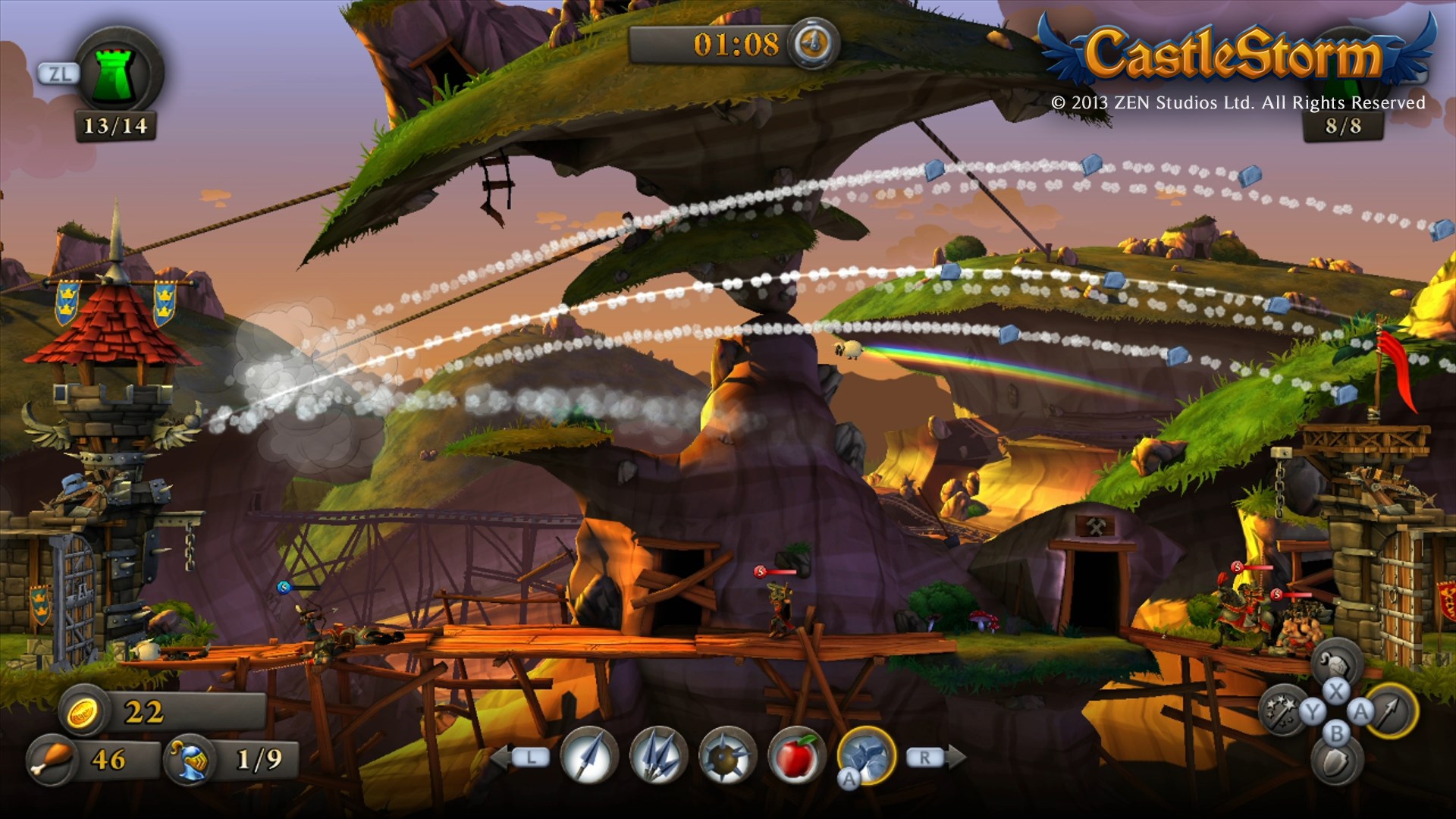 CastleStorm makes full use of the Nintendo Wii U Gamepad, which mirrors the action being displayed on the TV allowing the game to be fully playable on the GamePad without a TV. All functionality is available without touch as well, using the sticks and action buttons. In local multiplayer, one player uses the Pro Controller and looks at the TV, the other player uses the GamePad and plays on the Gamepad screen.
