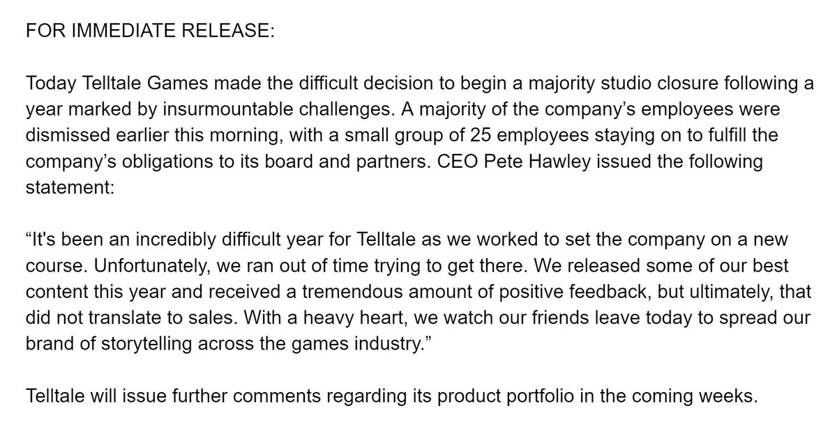 Telltale adds that it will have information about its product portfolio “in the coming weeks.”