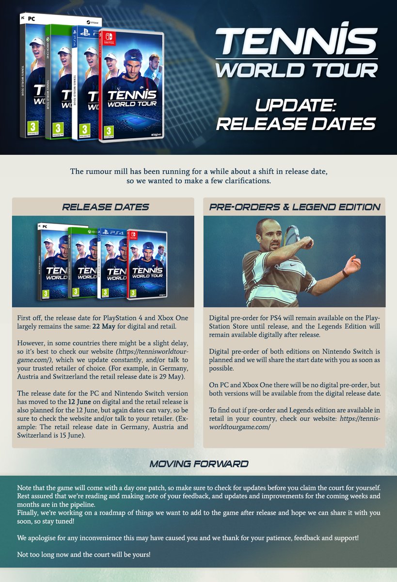 Tennis World Tour is now launching on June 12 for Switch in North America and Europe. However, there could be a slight delay for the physical version in some European countries.