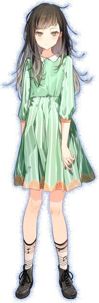She addresses everyone with “san” at the end of their names, and is for some reason very shy and distant, but on occasion will open her heart and blend in with the group. She behaves rationally, but genuinely expresses emotions such as happiness and enjoyment.