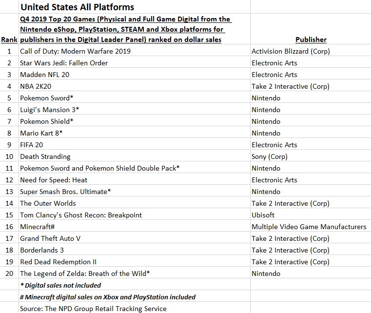 A new list from NPD reveals the top twenty best-selling games of Q4 2019 in the United States.
