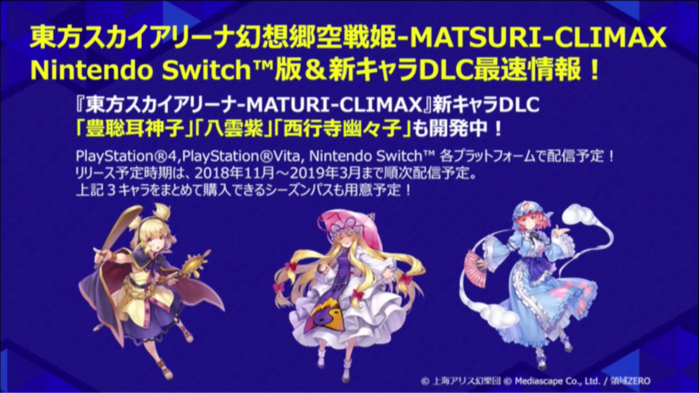 First up, Touhou Sky Arena: Matsuri Climax is coming to Switch either in November or December in Japan. The game is actually seeing a delay as it was previously planned for summer.