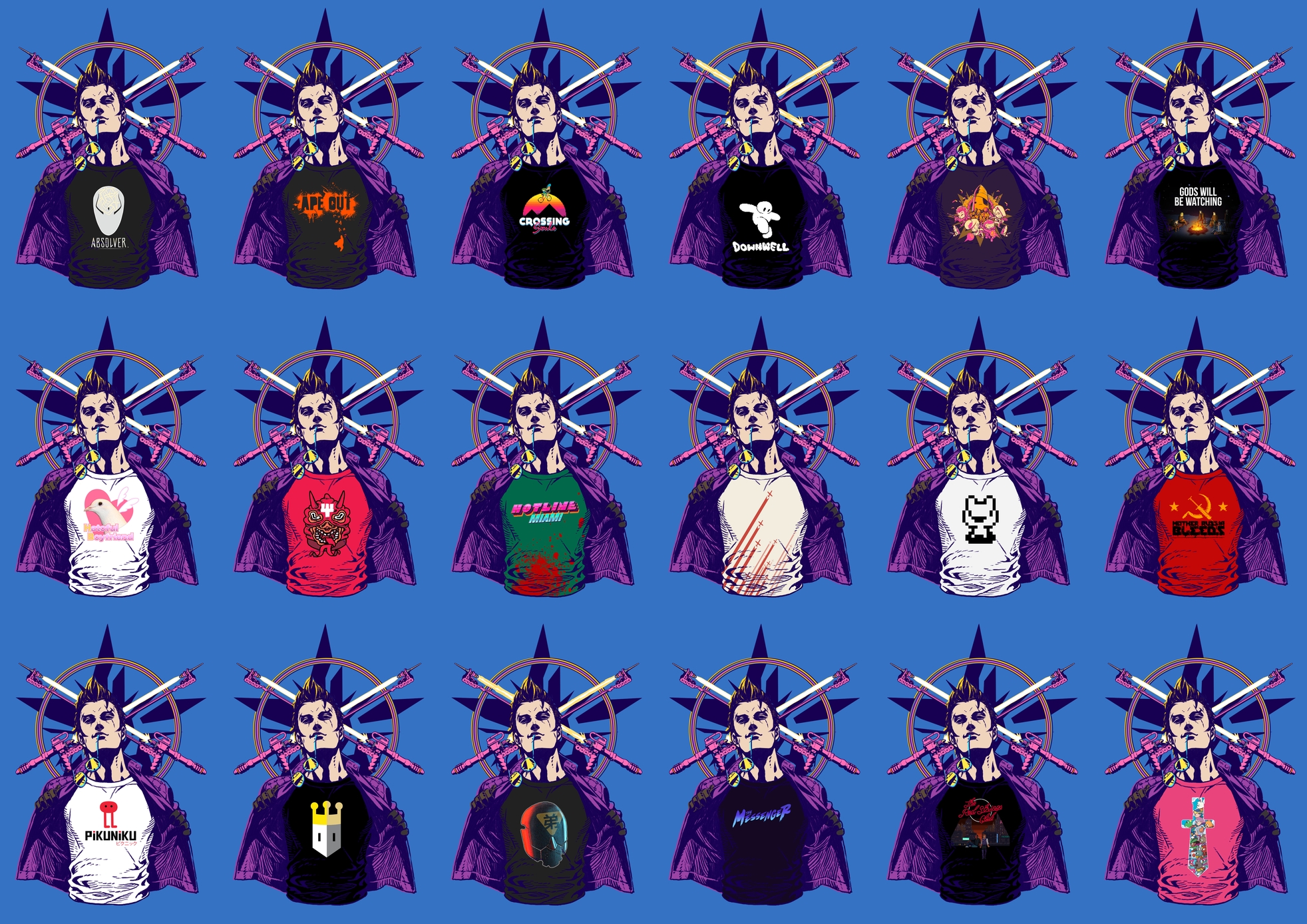 The release date isn’t the only new for Travis Strikes Again: No More Heroes. Grasshopper Manufacture also provides an update on the indie t-shirt collaborations, specifically regarding Devolver Digital titles. Players will be able to wear a bunch of shirts based on the publisher’s games, of which the full lineup is as follows: