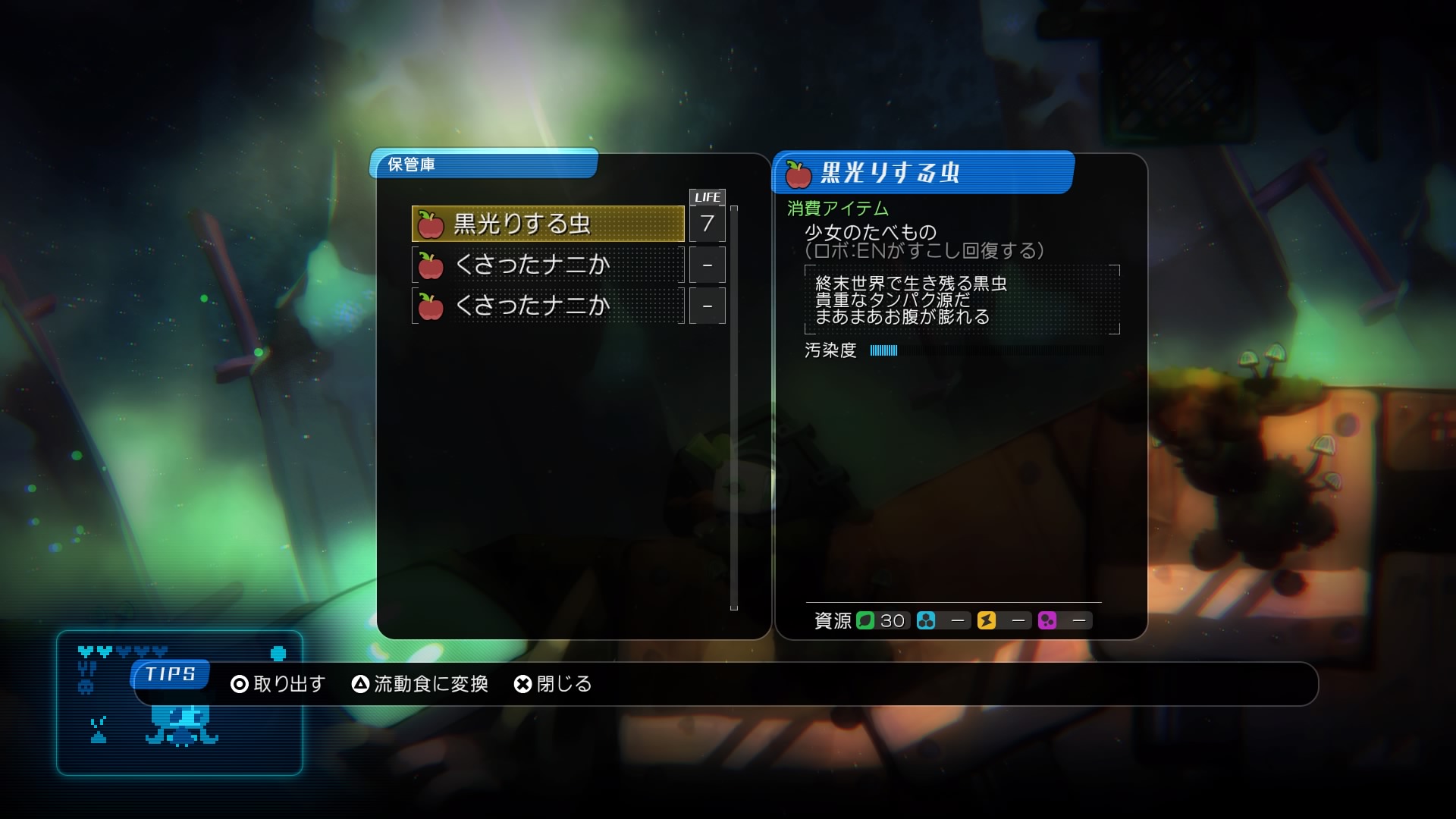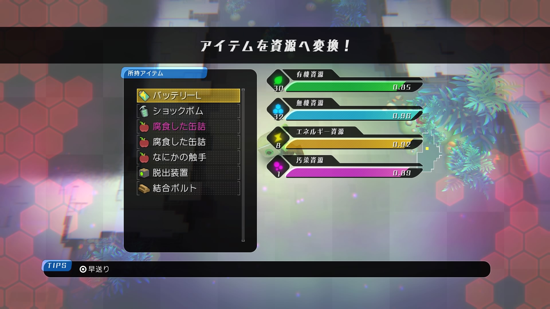 – Organic resources consist of various items such as repair items and potions