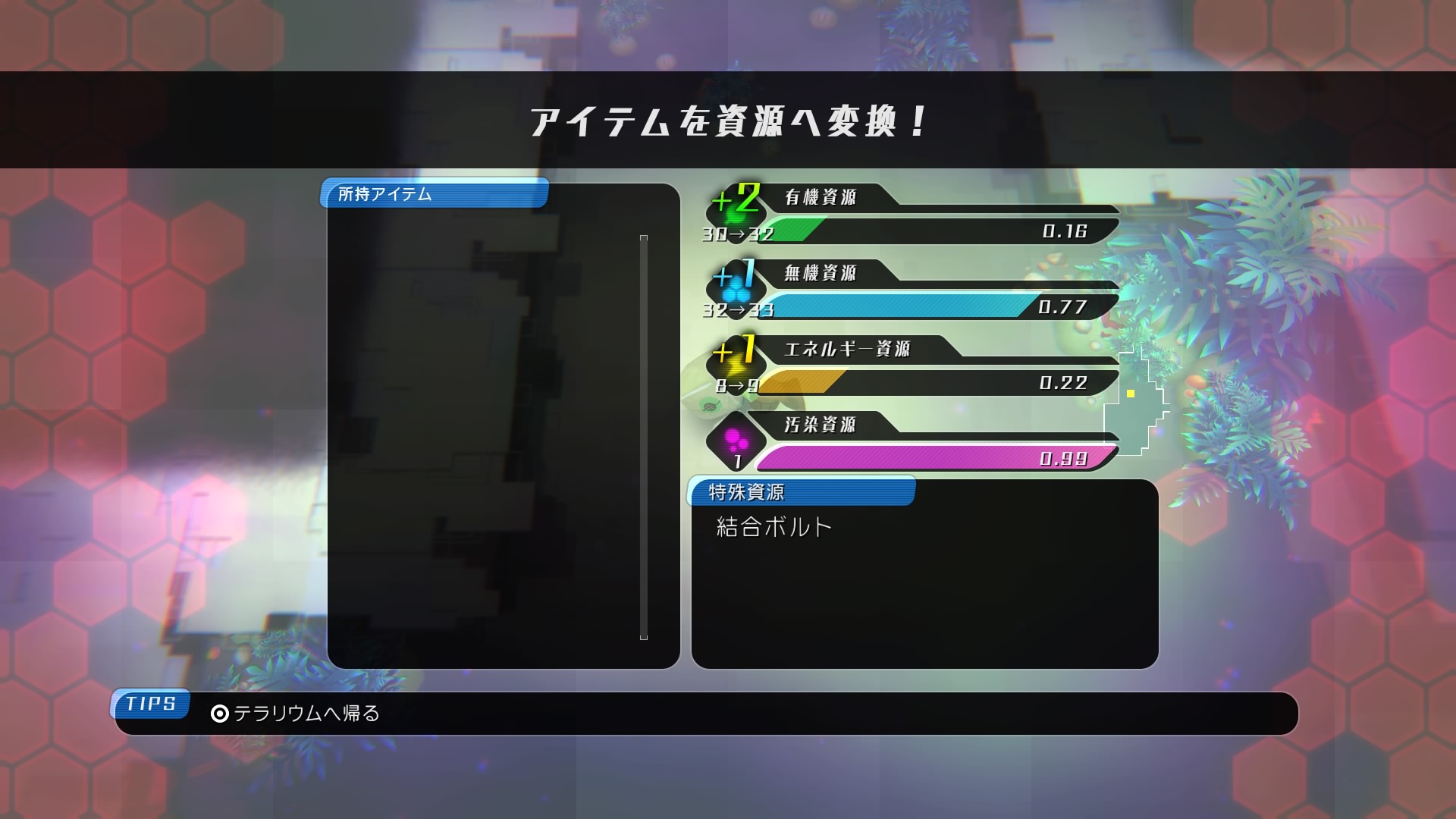 – After you finish exploring, objective items are brought back as “special resources,” while other items you picked up will be converted into four types of “resources”