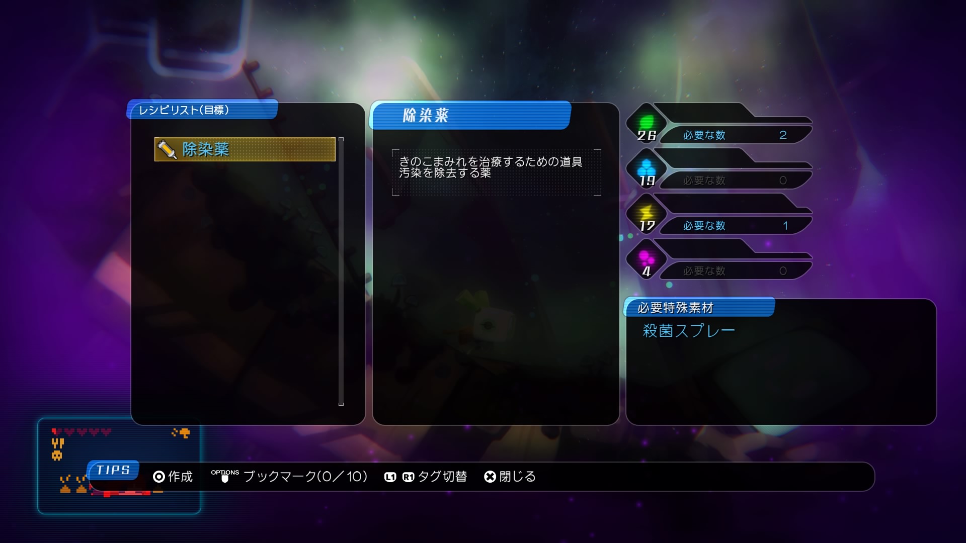 – Ex: if you want to create a “decontamination drug,” you will need the “sterilization spray” special resource, as well as two inorganic resources and one energy resource