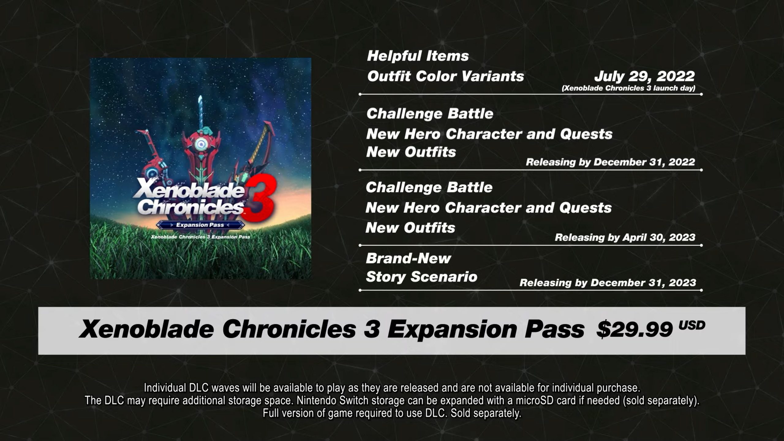 The Xenoblade Chronicles 3 Expansion Pass will go up for pre-order on the Switch eShop today. Pricing is set at $29.99.